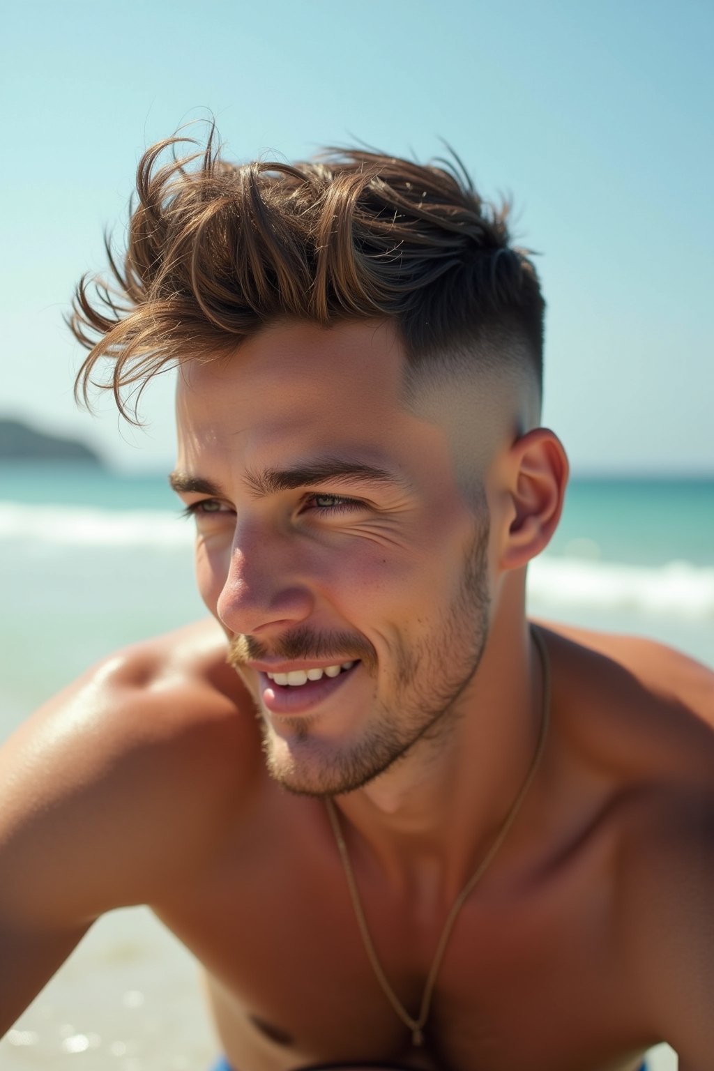 Der kurze Blowout Taper Fade vereint Stil mit minimalem Pflegeaufwand und ist damit die ideale Sommerfrisur für Männer mit aktivem Lebensstil. Die markante Kombination aus voluminösem Deckhaar und präzise ausrasierten Seiten hält selbst bei intensiven sportlichen Aktivitäten oder hohen Temperaturen perfekt. Während die oberen Haare genug Länge für verschiedene Styling-Varianten bieten, sorgt der Fade-Effekt für einen kühlenden Effekt im Nacken- und Seitenbereich – ähnlich wie bei anderen kurzen Fade-Varianten, die besonders im Sommer beliebt sind. Die einfache Pflege beschränkt sich auf gelegentliches Nachschneiden alle 2-3 Wochen und minimales Styling mit leichtem Haarwachs oder Texturspray, was diese Frisur zum perfekten Begleiter für den Sommer macht.