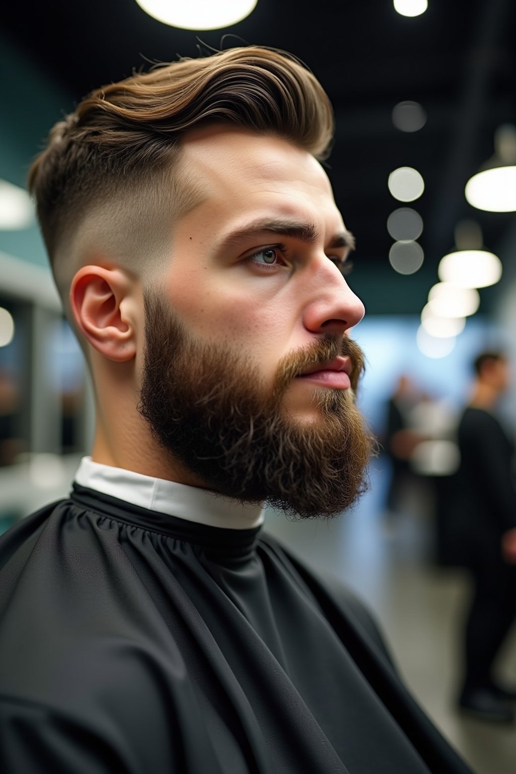 Die Kombination aus Blowout Taper Fade und einem präzisen Übergang zum Bart schafft eine harmonische Gesichtsumrahmung, die Ihre Gesichtszüge optimal betont. Der fließende Übergang von den voluminösen Haaren oben zu den kürzeren Seiten und schließlich zum Bart verleiht dem Gesamtlook eine durchdachte, zusammenhängende Ästhetik, die besonders bei Männern mit längeren Haaren an der Oberseite beeindruckend wirkt. Während die markante Blowout-Silhouette für Aufmerksamkeit sorgt, können Sie diesen Style auch hervorragend mit verschiedenen Längen kombinieren, um einen individualisierten Look zu kreieren, der perfekt zu Ihrer Persönlichkeit passt.