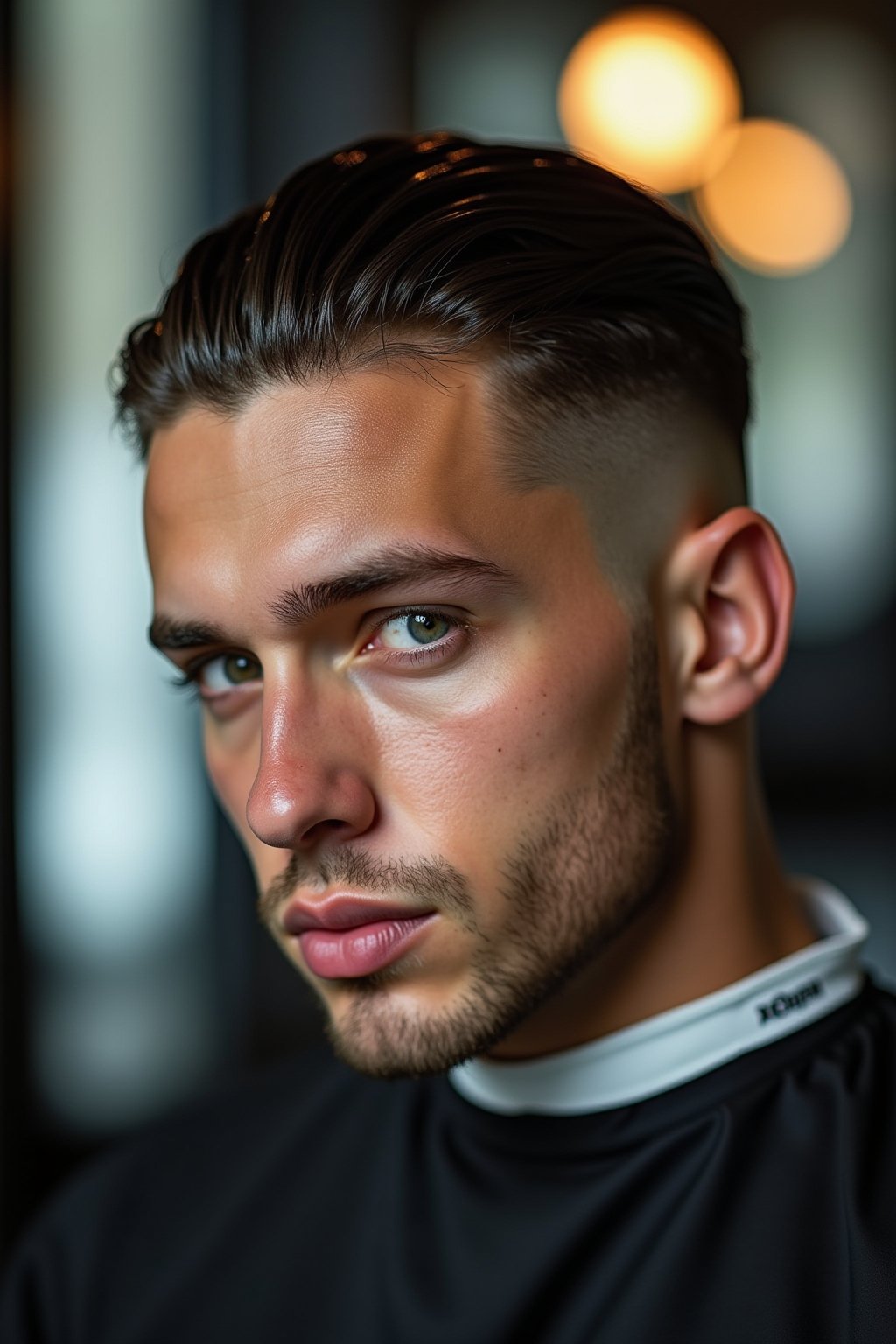 Der Slick Back Taper Fade kombiniert eine zurückgekämmte Oberpartie mit einem präzisen Übergang an den Seiten. Die längeren Haare oben werden nach hinten gestylt, während die Seitenpartien graduell kürzer werden – vom längeren Haar oben bis zur Kopfhaut unten. Diese Frisur vereint Eleganz mit modernem Undercut-Charakter und bietet vielseitige Stylingmöglichkeiten. Der Haarschnitt funktioniert besonders gut bei geraden bis leicht welligen Haartypen und erfordert regelmäßige Nachschnitte alle 2-3 Wochen, um die klaren Konturen des Tapers zu erhalten.